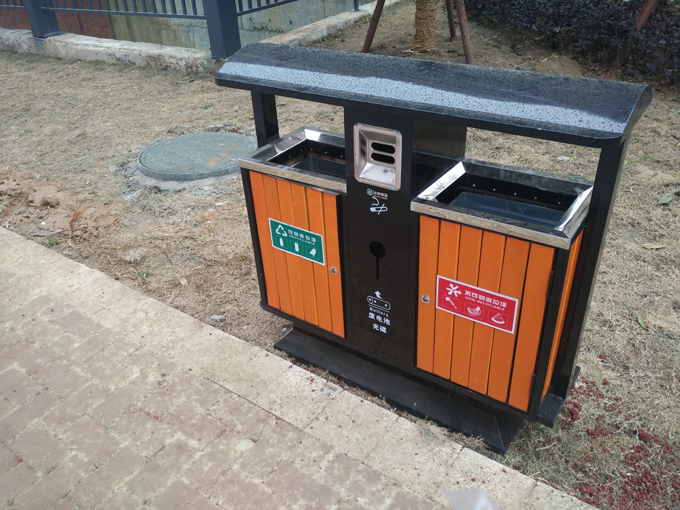 钢木垃圾桶HT-GM6850,该产品整体采用优质的冷轧钢板,镀锌钢板,防腐木生产加工而成,产品颜色为:黑色+原木色,规格为长1000mm宽360mm高1000mm,本款不锈钢包边钢木分类垃圾桶制造工艺采用:1、钢木垃圾桶桶身采用优质进口防腐木、进口山樟木或水曲柳制作,先经过烘干脱水、压刨、打磨、倒角、防腐处理后表面喷涂进口抗紫外线聚脂漆等工序,再经高温喷塑处理,可抑制微生物的寄生、繁殖与蛀蚀,具有防水、防霉等保护功效,能够抑制霉菌和藻类生物的生长,可有效减少紫外线导致的褪色,延长木材在户外环境中的使用寿命.客户也可以采用塑木代替实木.2、钢木垃圾箱采用镀锌钢板材质制作,钢结构均经过酸洗、磷化表面处理,然后再使用高温喷塑工艺,使垃圾桶更加经久耐用,防腐、防锈,美观大方.3、钢木果皮箱采用内部膨胀螺栓固定的方式,不易推到,不易被偷盗,使垃圾桶更加安全牢实.隐形固定还可以防止撞伤行人.
