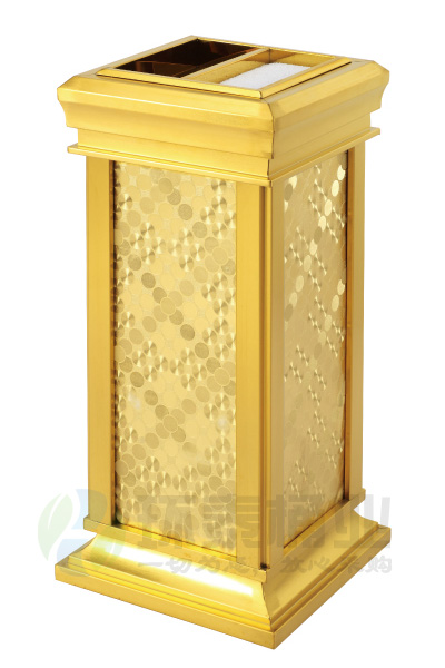 钛金垃圾桶HT-SN8070,该产品整体采用优质的镀锌钢板,钛金板生产加工而成,产品颜色为:钛金色,规格为长300mm宽300mm高650mm,本款钛金皇家座地垃圾桶采用模具冲压或折边拼焊成型;表面处理有镜面与砂面两种。金属框架选用高品质钢板折边拼焊成型,表面防锈处理后经户外粉末喷涂;木材经烘干、打磨、倒角、防腐处理后表面喷涂进口抗紫外线聚脂漆。生产工艺:不锈钢垃圾桶选用优质不锈钢经下料—折合—压筋—冲孔―成型,氩氟焊、打磨、抛光、打腊。顶盖采用滚压成型技术,HT-SN8070钛金垃圾桶也可按照您的具体需求可定制尺寸和颜色,可印制LOGO及文字,详见说明或咨询客服.环泰愿为环保护航,一切为您,放心采购。