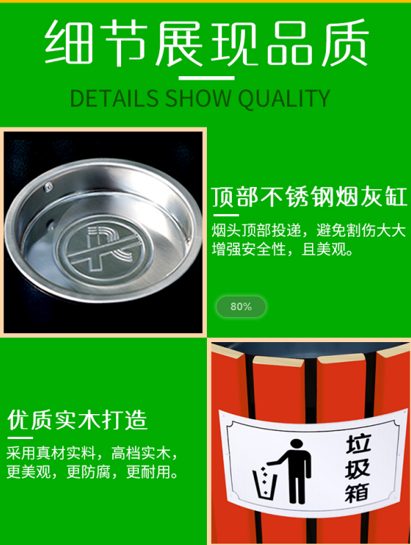 钢木垃圾桶HT-GM6090,该产品整体采用优质的冷轧钢板,镀锌钢板,防腐木生产加工而成,产品颜色为:黑色+原木色,规格为直径380mm高800mm,本款带烟缸圆柱形钢木小圆桶制造工艺采用:1、钢木垃圾桶桶身采用优质进口防腐木、进口山樟木或水曲柳制作,先经过烘干脱水、压刨、打磨、倒角、防腐处理后表面喷涂进口抗紫外线聚脂漆等工序,再经高温喷塑处理,可抑制微生物的寄生、繁殖与蛀蚀,具有防水、防霉等保护功效,能够抑制霉菌和藻类生物的生长,可有效减少紫外线导致的褪色,延长木材在户外环境中的使用寿命.客户也可以采用塑木代替实木.2、钢木垃圾箱采用镀锌钢板材质制作,钢结构均经过酸洗、磷化表面处理,然后再使用高温喷塑工艺,使垃圾桶更加经久耐用,防腐、防锈,美观大方.3、钢木果皮箱采用内部膨胀螺栓固定的方式,不易推到,不易被偷盗,使垃圾桶更加安全牢实.隐形固定还可以防止撞伤行人.