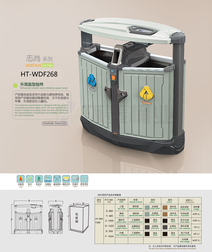 钢制垃圾桶HT-WDF268,该产品整体采用优质的电解溶镀锌板,塑料生产加工而成,产品颜色为:白色,规格为长960mm宽485mm高1000mm,本款德澜仕钢塑分类垃圾桶1、外观造型独特 产品整体造型采用大弧面与硬线条构成,既突显产品整体圆润稳重风格,又不失坚固与牢靠,外观更加引人瞩目。产品外形尺寸:长960mm X 宽485mm X 高1000mm,内桶容积:40L X 2,烟灰盒容积:1L,电子垃圾收集盒容积:3L。