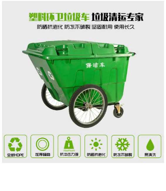 环卫垃圾车HT-LJC121,该产品整体采用优质的高密度聚乙烯(HDPE),塑料生产加工而成,产品颜色为:绿色,规格为长1250mm宽815mm高915mm,本款400L人力环卫三轮垃圾车,HT-LJC121环卫垃圾车也可按照您的具体需求可印制LOGO及文字,详见说明或咨询客服.环泰愿为环保护航,一切为您,放心采购。