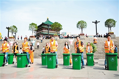 昨日15时,钟楼金花广场行人如织。突然,10个绿色的垃圾桶被人搬进了广场。10名身穿黄色保洁衣服的青年男女,用木棍在垃圾桶上敲打起来,奏响了美妙的乐章。原来是共青团陕西省委联合西安音乐学院团委,在西安市钟楼金花广场为全省广大青年们送出了一份特别的礼物—— “快闪”秀,以这种青年人的方式庆祝五四青年节。